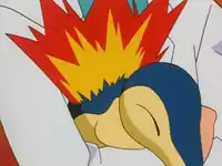 | Professor Elm's Cyndaquil is a starter Pokémon that he gives to new Trainers who want to start their Pokémon journey. It first appeared when Elm was holding it as he spoke to Ash and his friends who were very interested about it.