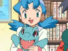 | Professor Elm's Totodile is a starter Pokémon that he gives to new Trainers who want to start their Pokémon journey. One appeared when Elm mistook Jessie for Nurse Joy and told her to check up on Totodile, who started to bite Meowth's tail and spray James with water, but the trio then stole Totodile. It later appeared when it would not let go of Jessie's hair but was taken off using Bulbasaur's Vine Whip and given back to Elm.