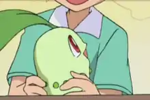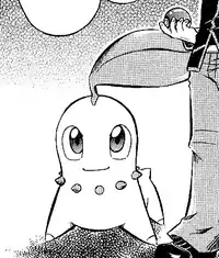 Chikorita ran away from Professor Elm's lab as he wanted to go out on an adventure. Crystal found him and was able to catch him along with a Victreebel. Crystal was reluctant to keep Chikorita on her team, but after noticing some strength he had, she decides to keep and name him Megaree (Japanese: メガぴょん Megapyon). | ||