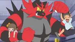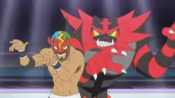 In A Young Royal Flame Ignites!, Incineroar took part in a battle against Mr. Electric and his Electivire. Despite Mr. Electric cheating, Incineroar held its own until it was attacked by Mad Magmar's Magmortar, resulting in Mr. Electric's disqualification. The Masked Royal and Incineroar were then challenged to another match by Mad Magmar the following day. The next day, they got to the ring just in time, but before the match could begin, Incineroar found itself under attack by the Revengers' Poliwrath, Alolan Muk, and Alolan Golem. Annoyed by their cheating, Ash and Torracat teamed up with the Masked Royal and Incineroar but were confronted by Viren, the leader of the Revengers. Viren planned to buy the Battle Royal Dome for it to become a part of the Rainbow Happy Resorts. A tag battle ensued with Ash and Masked Royal going up against Mr. Electric and Mad Magmar and their Electivire and Magmortar. Despite more foul play from the Revengers, the Masked Royal and Ash came out on top. Viren, not willing to give up just yet sent out his Pangoro but a combo move from Incineroar and Torracat sent them flying.