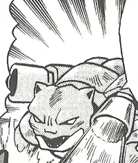 | Blastoise first appeared in a pond when Red and the group entered the Pokémon Zoo. Later, Clefairy rounds up Blastoise along with the other Pokémon. At first, Clefairy wasn't able to as Blastoise squished water at him.