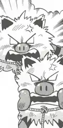 When it was nighttime, the Primeape were three of the Pokémon Red and the group tried to take from the zoo. After the zoo got burned down by the torch Clefairy was holding when he tripped on a pipe, one of the Primeape got burned by one of the flames coming from the fire. It was then angry at Clefairy for doing so. Afterwards, it once again beat up Clefairy. None of Primeape's moves are known. | ||