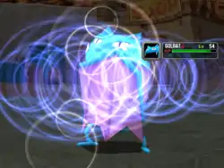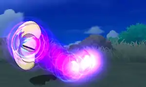 | Mismagius's outlines glow light blue and it releases a wave of energy out of its body. When it hits the opponent, its body glows multicolored and Mismagius can control the opponent, or Mismagius's body becomes outlined in light blue and it fires invisible or light blue shockwaves at the opponent from its body, or the gems on Mismagius's body glow pink and its body becomes outlined in light blue. It then fires multiple light blue tentacles from the outline at the opponent, or Mismagius's eyes become surrounded in multicolored energy and it fires a beam of multicolored energy from its eyes at the opponent. | |||