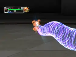Mewtwo releases a powerful tornado from its body that traps the opponent inside, or Mewtwo creates a spoon out of psychic energy and hits the opponent with it. When in the spoon form, Mewtwo can fire the energy from the spoon by transforming it into a fork and extending it. | ||
