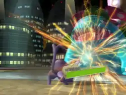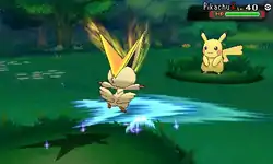 Pikachu runs quickly to the opponent or Pikachu dashes in the air and lands onto the opponent, leaving behind a trail of energy. | ||