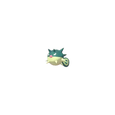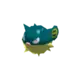 Qwilfish is a sea dwelling Pokémon with a spherical body and a flat, paddle-shaped tail. The upper half of its body is dark teal and the lower half is very light yellow. Its tail is tall and thin with a dark teal outline, light yellow inside, and two dark teal dots in the center. Its eyes are even with its body and are always seen slanted angrily. Below its eyes are its puffy pink lips. All around its body are sharp, conical spikes, which evolved from scales over time.