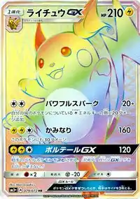 In Japan, this card was included as a Regular card, a Full Art card, and as a Secret card in the Shining Legends subset, each with artwork by 5ban Graphics. The Regular and Secret prints were included in the English expansion of the same name, while the Full Art print became a SM Black Star Promo available in the Shining Legends Special Collection—Raichu-GX released January 5, 2018. A Jumbo version was also included in the collection. The Regular print was reprinted as a Non Holofoil in the Japanese Lightning Raichu-GX Deck.