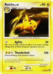Agility and Thunderbolt are both moves in the Pokémon games that Raichu can learn, though it could only learn Agility as a Pikachu prior the Generation VIII games. This card's Pokédex entry comes from Pokémon Pearl.