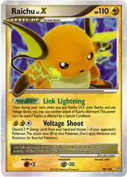 Raichu (Japanese: ライチュウ Raichu) is a Lightning-type Level-Up Pokémon LV.X card. It is part of the Stormfront expansion.
