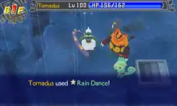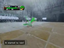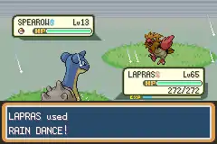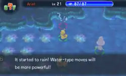 When this move is used, a rainfall will start on the field which will last for five turns. This clears any other weather and it's possible to use it even if it is already raining.