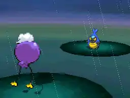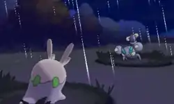 | Floatzel raises its arms into the air and the sky begins to become cloudy. Rain then begins to fall from the sky onto the battlefield. The rain will continue to fall until Floatzel puts its arms down. | |||