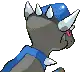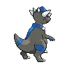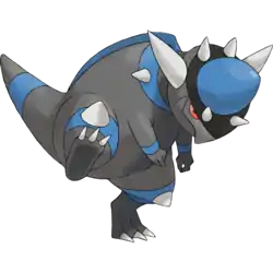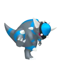 Rampardos is a large, dark-gray, dinosaur-like Pokémon resembling a Pachycephalosaurus. It has a dome head, which obstructs its red eyes. It has blue stripes, one on its tail, and one on each of its knees and wrists. It has various spikes: one on each knee, two on the blue collar on its neck, two short ones on its nose, and four on its head. Two of these head spikes are bigger than the other two.