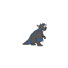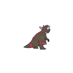 Its strength lies within its fierce head-butting attacks. A charging Rampardos can knock down virtually anything with one hit. 100 million years ago, it lived in jungles, where it tore down jungle trees while catching prey. It enjoys barging into objects with its head to train its strength and reflexes. This resulted in its skull becoming harder than steel and a foot thick, which prevents it from fainting if it crashes into anything, even another charging Rampardos. In ancient times, people would dig up its well-developed skull fossil and use it as a helmet. However, because its skull became so thick, its brain also became even smaller than that of Cranidos, leading to theories that it went extinct because of its stupidity. Its fossils have been found near those of Bastiodon, suggesting that these two lived in the same habitat.