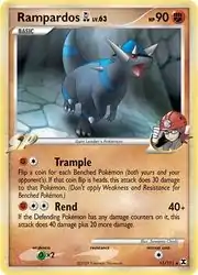 Gym Leader Roark owns a level 63 Rampardos when battled in the Battleground in Pokémon Platinum. Trample is an attack that first appeared on Tyranitar from Neo Discovery. The interior of the Oreburgh Gym is featured in the illustration.