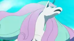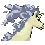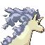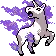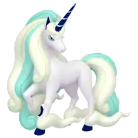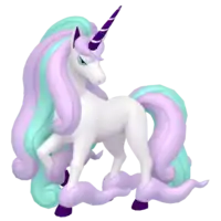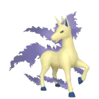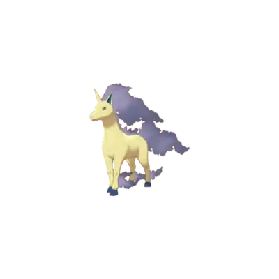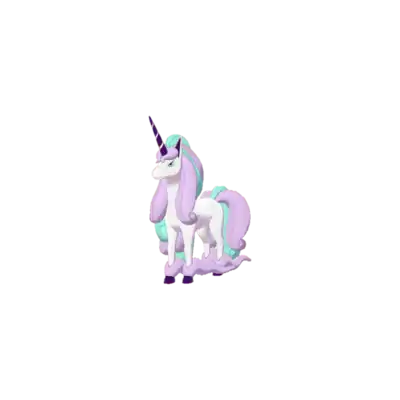 In Galar, Rapidash takes on a new form with a white coat, pale blue eyes, and a long, curly mane and tail colored in streaks of pastel cyan and pink. Its horn is much longer than that of regular Rapidash and is deep violet in color with a spiraling white line running its length. Its fetlocks are adorned with long pink fur that stores psychic energy, which gives it a swift, airy gait, and it has deep violet hooves.
