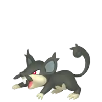 Rattata are non-native to Alola and arrived in cargo ships. The Rattata population in Alola was booming until Yungoos was imported as a control measure. In order to avoid these new predators, Rattata altered its habits. It moved to more urban areas, became nocturnal, and formed large nests led by Raticate.[1] Alolan Rattata searches out fresh food by smell and ignore anything spoiled. It has even been known to sneak into people's homes to find food. It has dark gray fur and grayish-purple ear insides. There are two tufts of fur on each ear and near the tip of its tail. Its long, thin whiskers are replaced by shorter, thicker tufts of fur as well. The line where its cream underbelly meets its gray fur is ragged instead of smooth. This variant of Rattata is the shortest Dark-type.
