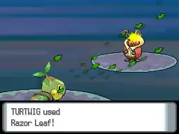 | Turtwig fires multiple razor-sharp leaves from the twig on its head at the opponent. | |||