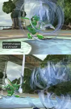 Scyther crosses its scythes and they start to glow white. It then brings them forward and multiple white crescent shaped energy beams come out and hit the opponent. | ||