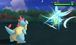 The scythe on Absol's head glows white and it swings its head, sending out a white or purple crescent blade of energy at the opponent. | ||
