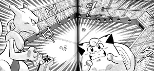 Clefairy dealt with Lance's Dragonite again when he was in a village. As Clefairy was about to defeat it for making the villagers suffer, Dragonite saved itself by saying that Lance is its savior and made up a story about how he found it abandoned when it was a Dratini. After the story, Clefairy forgave Lance and Dragonite. However, the story turned out to be made up when the parents of Lance's Dragonite arrived to pick them up. Clefairy chased after them while they escaped. Red went to a mansion and Clefairy had a rematch with the gag Mewtwo where it made an attempt to switch Clefairy's DNA with a Rattata's. However, this was foiled when Pikachu pushed it into the machine.