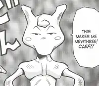 Still on Cinnabar Island, he goes to Blaine's restaurant where he and Green's Charmander get challenged by Blaine's Pokémon Quiz. Throughout the quiz, Clefairy got all of the answers to the questions wrong and got beaten by several of Blaine's Pokémon. Later, he challenged Blaine's Arcanine and both became covered in cement temporarily. Clefairy went to Giovanni's mansion when Green had a race with Red. In the mansion, he picked up a book on the bookshelf which turned out to be a switch for the secret laboratory. Clefairy noticed that Giovanni and his twin brother were creating Mewtwo using a Mew held hostage by them. When Mewtwo broke out of the machine, Clefairy had a battle with it. As Giovanni made Mewtwo to be very powerful, Clefairy was no match for it, until he threw it in a machine. Clefairy went in the same one and had Bill mix his DNA with Mewtwo. After the process was complete, Clefairy got out and noticed from a mirror that he had Mewtwo's form. The battle continued and Clefairy defeated Mewtwo. Afterwards, he goes inside the machine again with Giovanni's Pokémon. Clefairy returned to normal and Giovanni's Pokémon had Clefairy's face on them.
