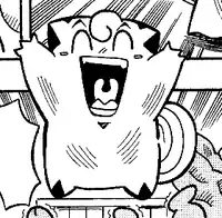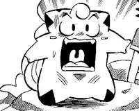 Clefairy officially debuted in the first chapter where he was a wild Pokémon living in a field. Red, racing to get to Professor Oak's lab before his rival Green does, decides to take this field as a shortcut where he finds a wild Nidoran♂ and the Clefairy who attempt to attack him. Clefairy drops some coconuts on Red from a tree above, only to shortly fall off and drop onto the Nidoran♂, knocking him out. Red thanks Clefairy for the help and continues to run for the lab, finding that Green had already made it there. While the three discuss about Professor Oak's favor of completing the Pokédex, Clefairy bursts into the lab and is yelled at by the professor. When given the choice of which starter Pokémon he wants, Red decides to take Clefairy with him, which thrills the Pokémon greatly. Green is however skeptical that Red can be a successful Trainer with a Clefairy, and has his chosen starter Pokémon Charmander attack the Clefairy, setting his tail on fire and causing the Pokémon to run around frantically, which sets the entire lab on fire and enrages Professor Oak.
