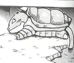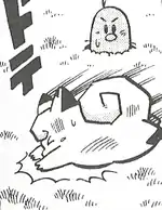 This Pokémon is never referred to by name and its identity is unknown. Although fans usually interpret it as a Bug-type, it is possible that it actually represents a Diglett with the patch of the ground beneath it misinterpreted as its legs, as many of the Pokémon appearing in the first volume of the manga were drawn based only on in-game sprites, resulting in numerous misinterpretations (e.g. Persian's jewel mistaken for a third eye). | ||