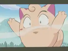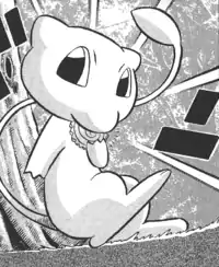 | Mew first met Red when it ate all of Clefairy's food. Clefairy, angry at it for stealing, decides to pick a fight with it but was unsuccessful. Despite that, it stayed with the group for a little while. Mew left somewhere after Clefairy decided to go primitive.
