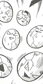 In Red VS Green?!, another one appeared where Clefairy disguised them as balls for the playing field. As Clefairy threw Exeggcute, it attacked Green's Pokémon especially his Charizard and Blastoise. Blastoise deflected the Exeggcute back to Red's side and then they went to the audience, much to their horror. None of Exeggcute's moves are known. | ||