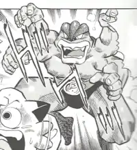 | While Red and his friends were in a department store, Machamp, as a Machoke, along with a Caterpie, Butterfree, Kakuna and Ekans were robbing the department store. Red was able to stop Caterpie and its evolutions. But, the Fighting-type Pokémon was the only one left. Clefairy created a distraction for Machoke so Red can catch it. Machoke evolved into Machamp and it became a tough foe for them to handle. It took several tries for Red to catch it and he finally caught it after Clefairy was about to give up. Later, Machamp and Clefairy cheated in the Athletic Meet by disguising himself as Clefairy and flinging a Snorlax away.