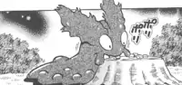 | A Gastly showed up while Red had a confrontation with Giovanni and his twin brother. This Gastly was out of its gas form. | ||