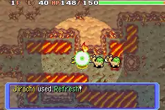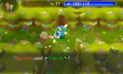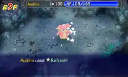 In Red Rescue Team and Blue Rescue Team and Explorers of Time and Darkness and Sky, Refresh is a move with 17PP that ignores accuracy and evasion checks. It cures all allies in the same room as user of all status conditions that are considered negative, such as Slowed Down, Nightmare or Constriction, as well as removing move seals (even though they aren't considered a status condition by the game). In hallways, this move targets Pokémon up two tiles away (or one in one-tile darkness). This move is affected by Taunt and Snatch.