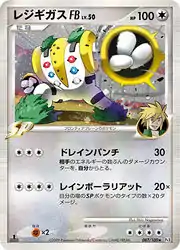 Palmer owns a level 50 Regigigas in Pokémon Diamond, Pearl, and Platinum. Drain Punch is a move in the Pokémon games that Regigigas can learn via TM60. The interior of the Battle Tower as it appears in Pokémon Platinum is featured in the illustration.