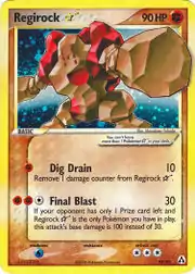 Dig Drain's Japanese name first appeared as the Draining Cut attack on Kabutops from Skyridge. This card is based on the Shiny version of Regirock.