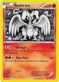 Outrage and Blue Flare are both moves in the Pokémon games that Reshiram can learn. This card's initial Pokédex entry comes from Pokémon Black. The Radiant Collection print's Pokédex entry comes from Pokémon Black 2 and White 2
