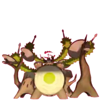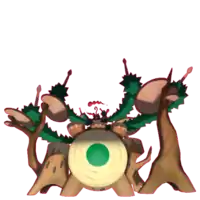 As Gigantamax Rillaboom, its upper body fuses with its enlarged tree-stump drum. The stump changes to resemble a full drum kit. The leaves expand to become four arms, each holding a drum stick while its single vine-like hair stands up and curls at the tip. As with all Gigantamax Pokémon, three red clouds circle above it. Rillaboom controls the drumsticks to perform transcendental drumming techniques. It is compelled to drum due to its power building up from inside. The sounds it makes can reach across oceans and other regions. Those who hear the beat will start to dance uncontrollably.[2]