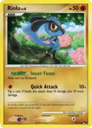 Inner Focus is an Ability in the Pokémon games that Riolu can have. Quick Attack is a move in the Pokémon games that Riolu can learn. This card's Pokédex entry comes from Pokémon Pearl.
