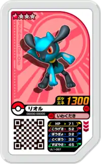 Riolu (Japanese: リオル Riolu) is a Grade 1 Pokémon Ga-Olé disk. It is part of the first Ultra Legend set.