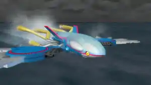 The Robo Kyogre and the Luxo Cruiser are the only two sea craft that are capable of traveling to Citadark Isle without being inhibited by violent currents or blinding the riders by the thick fog. The Robo Kyogre's design resembles the Legendary Pokémon Kyogre even less than the Robo Groudon resembles a real Groudon. Robo Kyogre has a large, spacious cockpit covered up by a large windscreen. On the back are eight long yellow tubes that use jet propulsion to make the Robo Kyogre achieve high speeds. Robo Kyogre's flippers each have circular rotating mechanisms that spin when the Robo Kyogre is in motion. Its flippers fold to its sides facing up when Robo Kyogre is in a port.