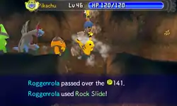 - In Goodbye to a Peaceful Village!, Ginji and Mudkip combined their respective Flamethrower and Water Gun to create a Rock Slide, which they used to defeat Moltres.