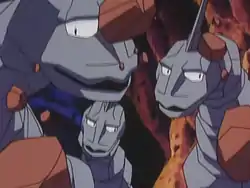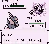 Onix slams its tail onto the opponent; or, Onix yells out and rocks fall at the opponent; or, if Onix is near a cliff or inside a cave, Onix slams its head against a wall and rocks fall from the ceiling; or, Onix slams its tail into the ground and rocks fly out at the opponent. | ||