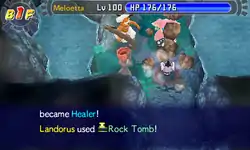 | Meditite points at the ground, causing a large pile of stones to shoot up from the ground at the opponent. | |||