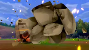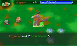 Rhyperior puts its hands together, and small chunks of gray stones come out of the holes on Rhyperior's hands and form together into a large gray rock that is outlined in red. The red outline then fades and Rhyperior throws the rock at the opponent. | ||