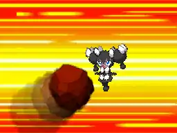 Rhyperior puts its hands together, and small chunks of gray stones come out of the holes on Rhyperior's hands and form together into a large gray rock that is outlined in red. The red outline then fades and Rhyperior throws the rock at the opponent. Rhyperior becomes tired out for a while after the attack is used. | ||