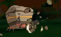Crustle puts its claws together in front of it and a small gray stone with a red aura around it forms in between them. The rock then grows larger until it is as large as Crustle itself. Crustle then fires the giant rock at the opponent. | ||