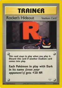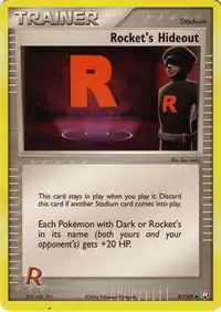Rocket's Hideout (Japanese: ロケット団のアジト Rocket Gang's Hideout) is a Stadium card. It is part of the Neo Revelation expansion.