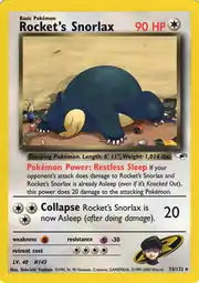 Rocket's Snorlax (Japanese: R団のカビゴン Rocket's Kabigon) is a Colorless-type Basic Pokémon card. It is part of the Gym Heroes expansion.