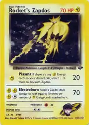 Rocket's Zapdos (Japanese: R団のサンダー Rocket's Thunder) is a Lightning-type Basic Pokémon card. It was first released as part of the Gym Challenge expansion.