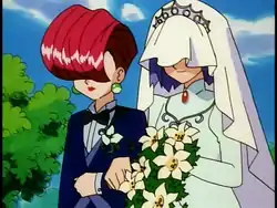 During Round Four in Spa Service, they are wearing their bride and groom clothing from the episode Wherefore Art Thou, Pokémon?. Unlike the episode, Meowth is dressed as a flower girl and the background music is "Treulich Geführt" by Richard Wagner, known in English as the "Bridal Chorus".
