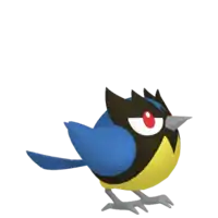 Rookidee is a small, birdlike Pokémon that is primarily dark blue, including its wings, tail, back and part of its head. The lower part of its body and chest is yellow and has a black part that begins from under its wings to its face, from which feathers protrude over its head, giving it a mask-like appearance. It has red eyes and small gray feet and legs.